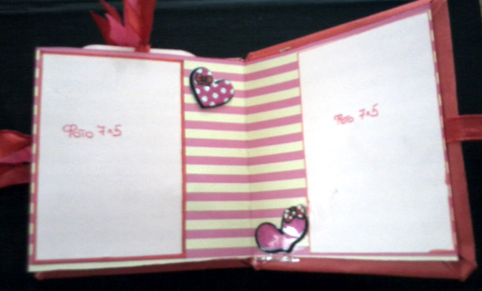 - обложка из гофрокартона, двусторонней цветной бумаги, покрытой глиттером, сердечки тоже из картона и глиттера, ленточка из приклееных на двусторонний скотч ниточек (на клее они теряют свои гладкость и нежность) и вырезанной фигурными ножницами полоски бумаги, надпиь ...from hearts to your heart... сделана гелевой ручкой с блестками